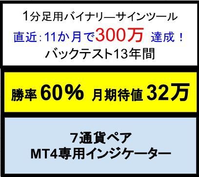 1分足判定バイナリー用サインツール【7通貨ペア】  勝率60% 月間期待値:合計30万円以上