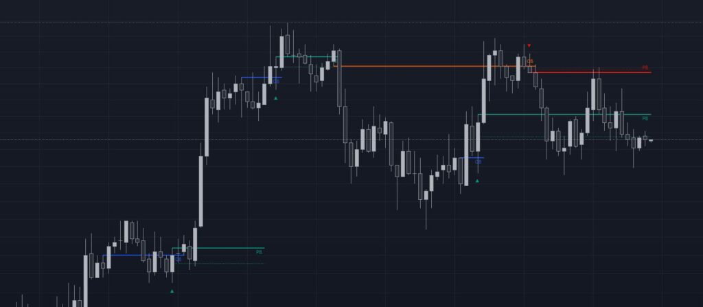 推進ブロックは、価格が前のオーダーブロックと相互作用する場所に位置するブロックです。トレーダーは、価格の動きを分析して潜在的な転換点や市場の動向、または市場での関心のあるエリアを特定する際に、これらを利用することがよくあります。