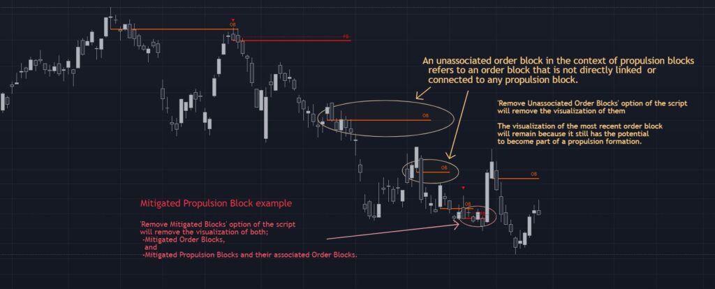- 緩和されたブロックの削除:緩和されたオーダーブロックと推進ブロック、およびそれに関連するオーダーブロックを排除し、より明確な分析のために視覚化を簡素化します。