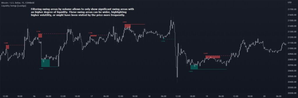 ボリュームでスイングエリアをフィルタリングすることで、より高い流動性を持つ重要なスイングエリアのみを表示できます。これらのスイングエリアは広くなる可能性があり、高いボラティリティを強調表示するか、価格がより頻繁に訪れた可能性があります。