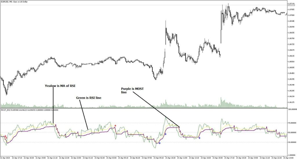 RSIに追加されたMOSTは、RSIの移動平均と、移動平均のトレーリングパーセントストップレベルを持ち、MAの長さとストップレベルの%を変更することで調整可能です。
