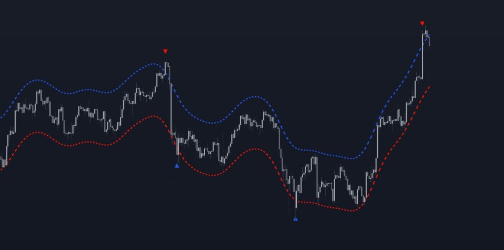 このツールは、選択したウィンドウサイズ内の価格によって作成された極値を示します。これは、カーネルスムージングを使用して価格の基礎的なトレンドを推定し、それからの平均絶対偏差を計算し、推定された基礎的なトレンドから加算または減算することで達成されます。