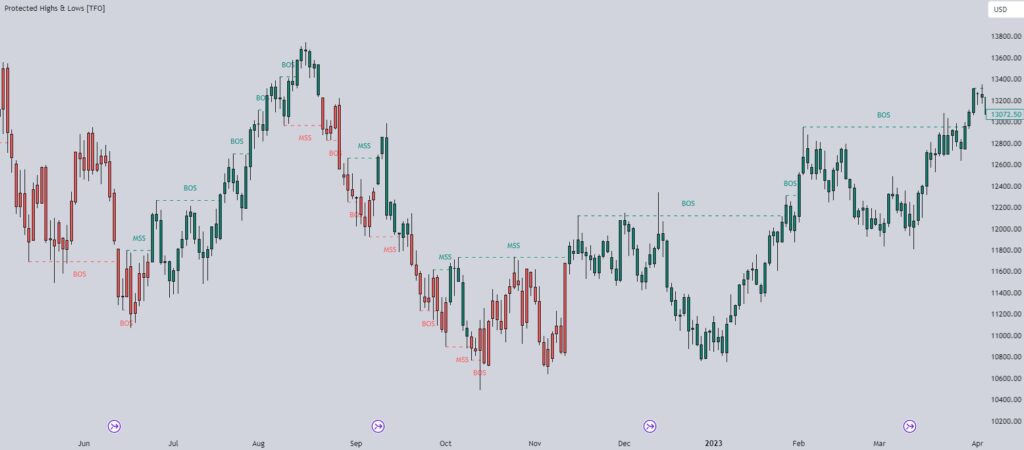 市場構造を定量化する際には、フラクタルの高値と安値を使用して「重要な」スイングピボットを特定することが一般的です。価格がこれらのピボットを通過して閉じると、反転のための市場構造シフト(MSS)または継続のための構造のブレーク(BOS)を特定することができます。この「保護された」論理の主な違いは、有効なMSSまたはBOSを特定するために使用されるピボット/レベルをどのように決定するかにあります。